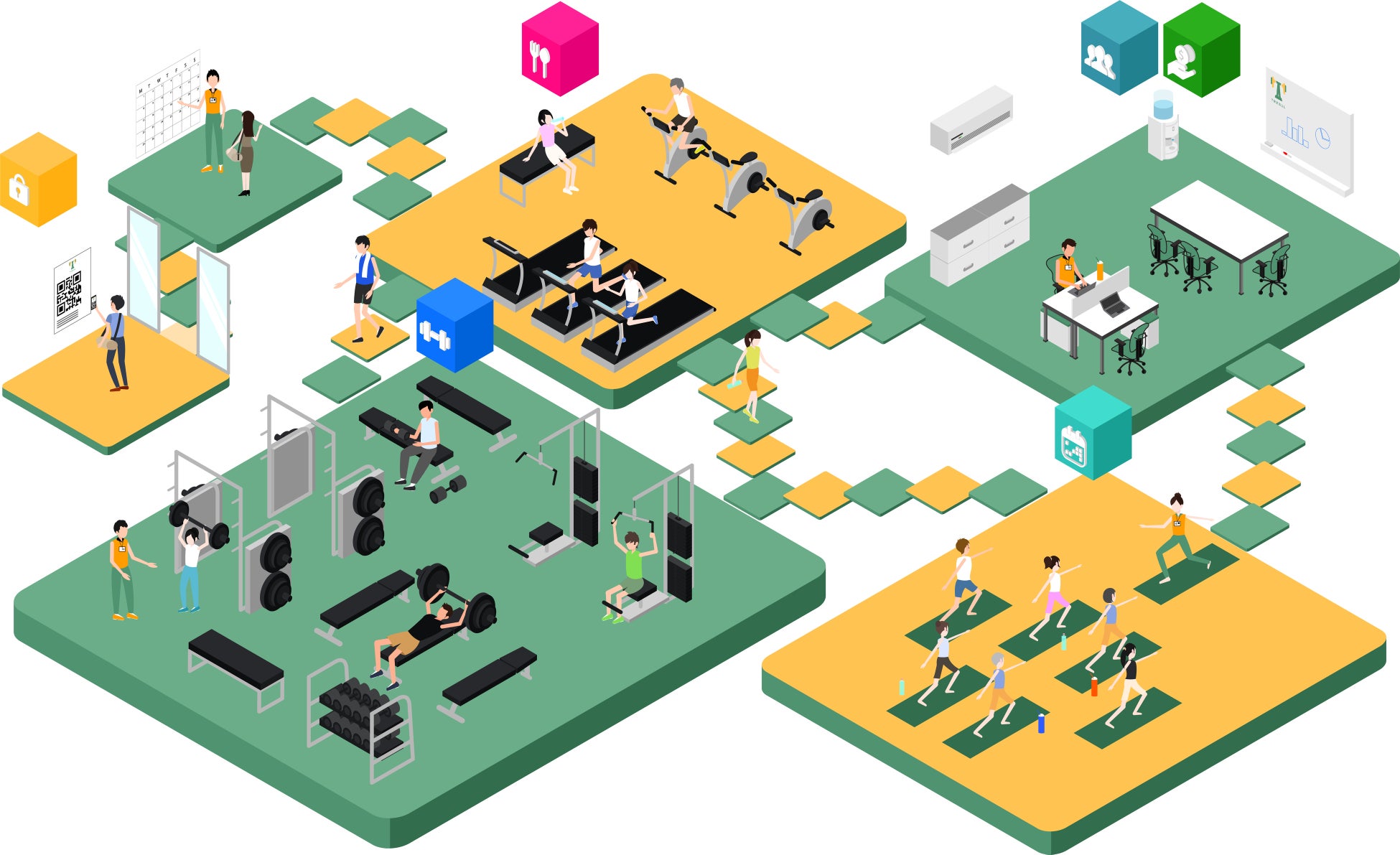会員情報や予約の管理など、ジム運営に欠かせない基本的な業務のほか、トレーニングや食事の管理、決済管理や施錠管理まで、ジム運営にかかわる業務をトータルでサポートします。