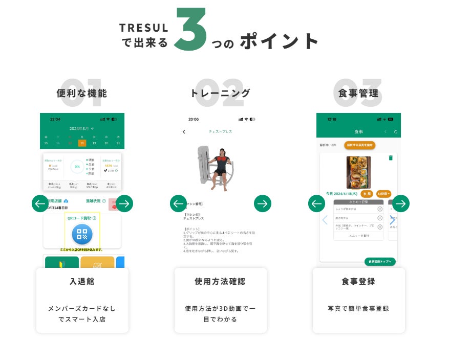 最先端トレーニングアプリ「TRESUL」を使って、マシンの使い方や正しいフォームを習得し、最適なトレーニングプランや食事プランを提案します。