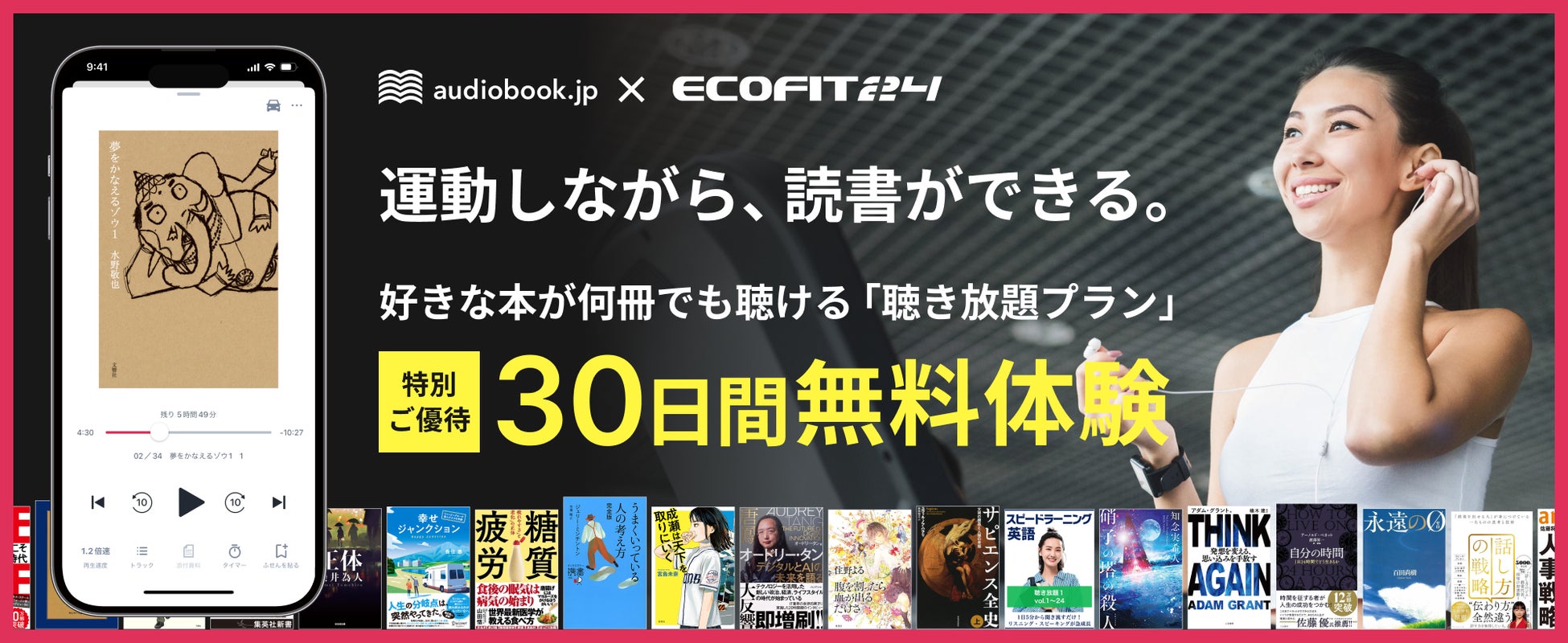 ECOFIT24(エコフィット24)会員の方は、audiobook.jp(オーディオブックJP)の「聴き放題プラン」を30日間無料でご体験いただけます。