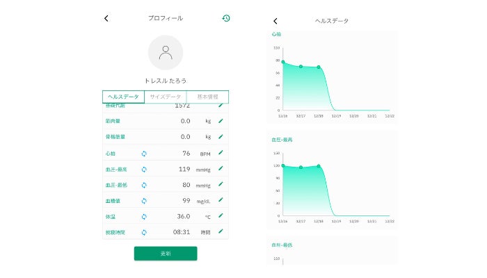 会員専用アプリ「TRESUL(トレスル)」は、バイタルデータの追加により健康管理機能を強化し、トレーニングと健康状態を総合的に分析できるようになりました。さらに、iOSやAndroidのヘルスケアアプリとの連携で、デバイスからのデータ取得も可能です。
