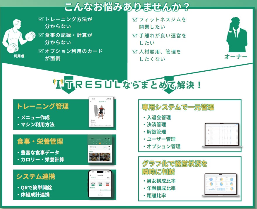 月額2,980円(税別)で、24時間365日いつでもお好きな時間にご利用いただけるフィットネスジムです。フィットネスマシンメーカーが厳選した豊富なマシンに加え、最先端フィットネス管理システム「TRESUL(トレスル)」を導入し、アプリで簡単に「トレーニングプラン管理」「食事管理」「入退館管理」を行うことができます。